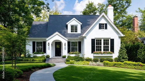 © kenza07, Fototapeta premium Stunning White House with Black Shutters and Landscaped Garden