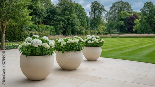 Obraz premium Stunning white hydrangea plants flourish in large round stone pots on a tranquil patio, framed by tall trees and grasses of an English garden, creating a serene atmosphere
