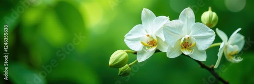 Fototapeta premium Stunning White Orchid flower with delicate green leaves, nature, greenery