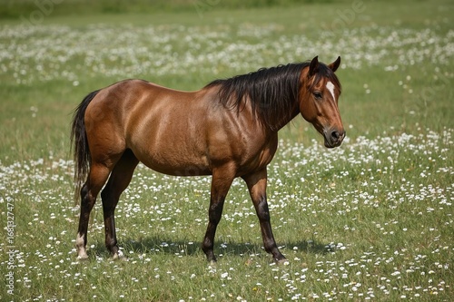 © Giovanni, Fototapeta premium Stunning wild brown stallion grazing in a vibrant summer meadow filled with flowers. Portrait of a majestic horse with a flowing mane standing tall outdoors. Large equine stallion in natural