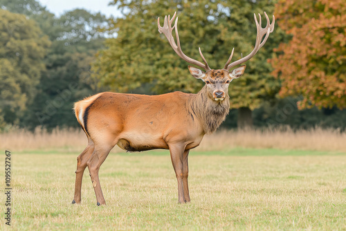 Fototapeta premium Stunning Wildlife Portrait of a Majestic Deer with Antlers in a Golden Autumn Landscape for Seasonal Art, Nature Projects, and Rustic Decor
