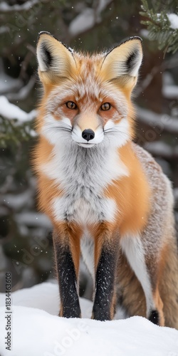 Fototapeta premium Stunning winter scene featuring a red fox beautifully captured in fresh snow among evergreen trees.