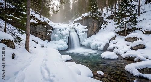© Stock, Fototapeta premium Stunning Winter Waterfall Scene with Snow and Ice Formations.