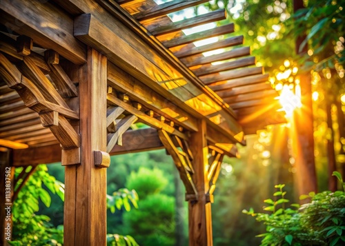 © Manatsavee, Obraz premium Stunning Wooden Awning Frame Photography: Eye-Level Shot, Rustic Charm, Outdoor Shade Structure