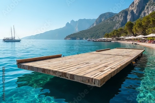 © PomPam, Obraz premium Stunning Wooden Pier Over Crystal-Clear Water with Mountains and Boats in Background