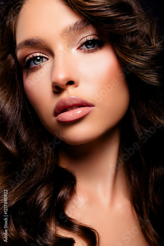 Fototapeta premium Stunning young female model with alluring eyes and brunette hair posing...