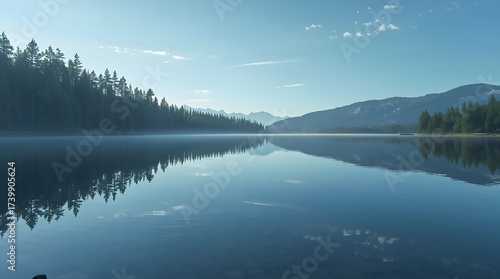 Fototapeta premium Stunningly serene lake reflecting mountains and forest under a clear blue sky, perfect for inspiring travel, nature, and peaceful contemplation