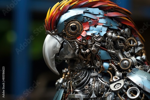© juliars, Fototapeta premium Sturdy Steelpunk metallic parrot. Art nature. Generate Ai