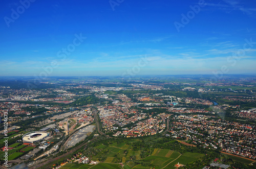 © Mirjam Claus, Naklejka premium Stuttgart - June 11, 2017: Closer Aerial view of Stuttgart area and soccer stadium, south germany on a sunny summer day