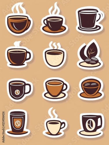 Obraz premium style stickers featuring coffee cups and coffee beans ideal for decoration or branding projects. Generative AI