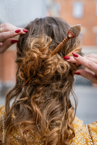 © melnikviva, Obraz premium Styling Hair with Wooden Hairpin for a Casual Updo