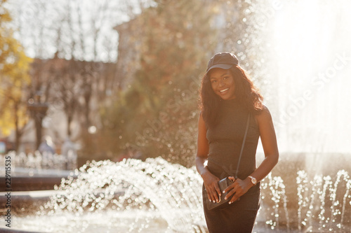 © AS Photo Family, Obraz premium Stylish african american girl in gray tunic, crossbody bag and cap posed at sunny autumn day against fountains. Africa model woman.