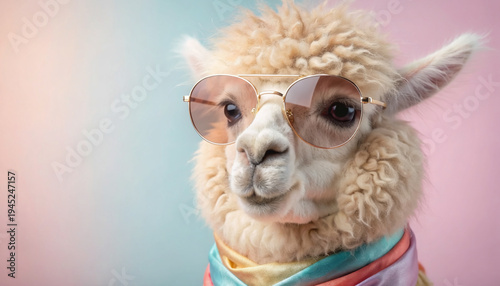 © Nadya, Fototapeta premium Stylish Alpaca Wearing Sunglasses With Colorful Scarf Portrait