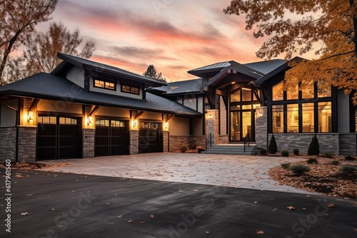 Fototapeta premium Stylish and Spacious: A Newly Built Home With Sleek Architecture, a Three-Car...