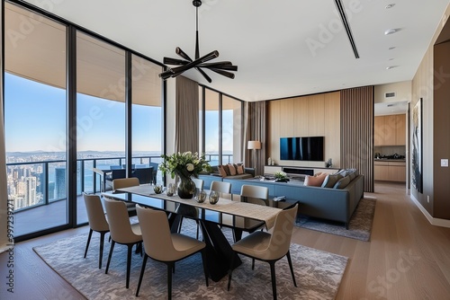 © Michael, Fototapeta premium Stylish Apartment Design with Expansive Dining Area and Open Living Room Showcasing Stunning Panoramic Views