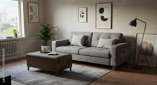Fototapeta premium Stylish Apartment With A Modern Sofa And Storage Ottoman Illustration