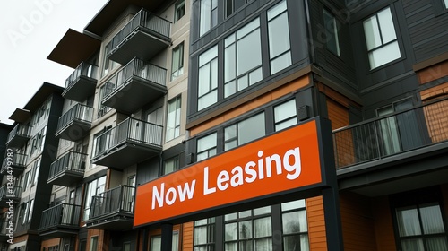 Obraz premium Stylish apartments with modern design and a bright "Now Leasing" sign displayed