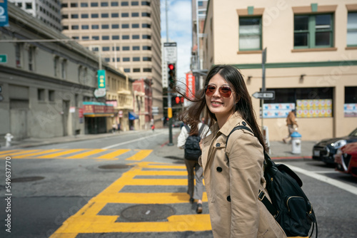 Fototapeta premium stylish asian Taiwanese girl backpacker turning to smile at camera with blowing hair near crosswalk on street while waiting for traffic red light near china town in san Francisco California usa