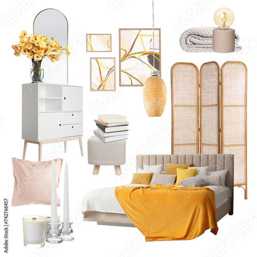 © New Africa, Fototapeta premium Stylish bedroom interior with different decorative elements and furniture on white background. Mood board collage