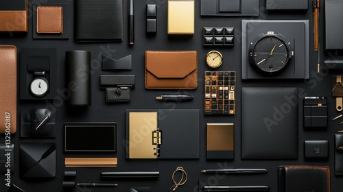© Kharkovich, Obraz premium Stylish black and gold office supplies with leather accents arranged neatly