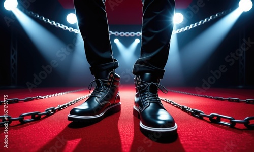 © PlatypusMi86, Fototapeta premium Stylish black boots on red carpet in dramatic spotlight setting