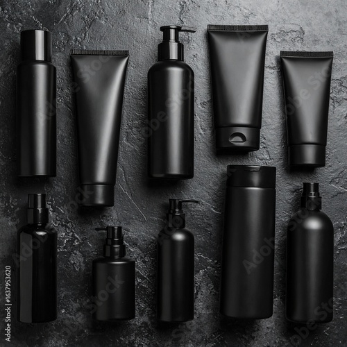 Fototapeta premium Stylish black cosmetic packaging set with bottles, jars, and boxes on dark textured background.