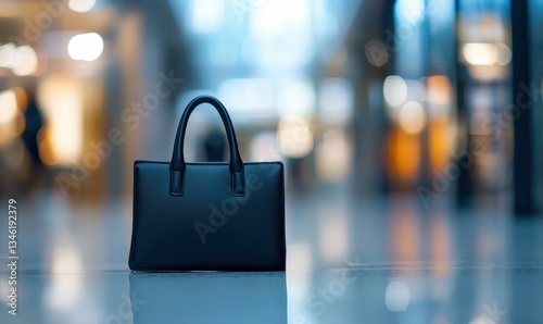 © NovaVision, Naklejka premium Stylish black leather handbag sits elegantly on a polished floor in a modern, blurred background.