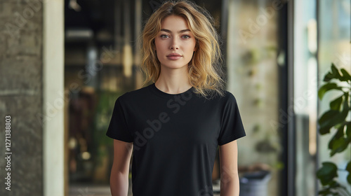 © agungmujtaba, Fototapeta premium Stylish Blonde Woman in a Black T-Shirt Standing in an Industrial Setting – AI Generated