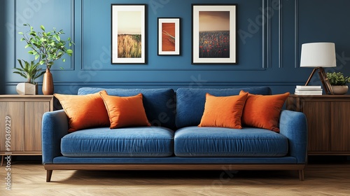 © wacharagorn, Fototapeta premium Stylish blue sofa with orange cushions in a modern living room setting featuring framed artworks and decorative plants.