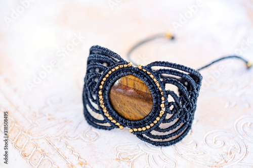 © marbenzu, Fototapeta premium Stylish boho macrame string natural mineral stone bracelet on white decorative background