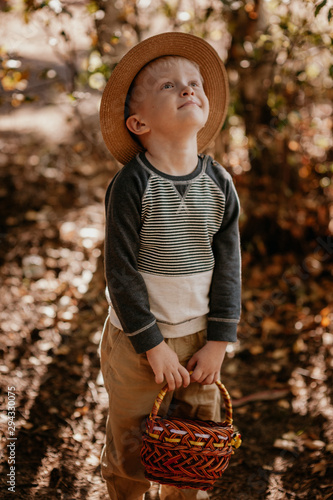 © andreiko, Obraz premium Stylish boy in a hat with a basket. boy in the park in a hat with a basket in autumn