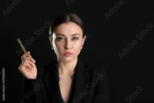 © Pixel-Shot, Obraz premium Stylish businesswoman on dark background