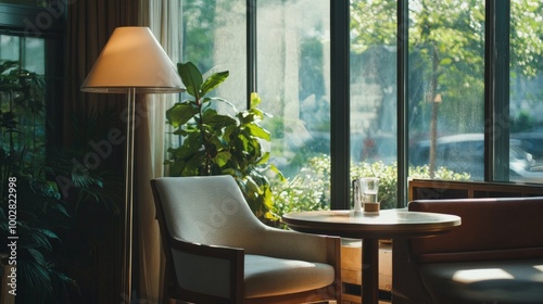 © Intach, Obraz premium Stylish cafe interior featuring an armchair, table, couch, and lamp, with large clear windows offering bright light.