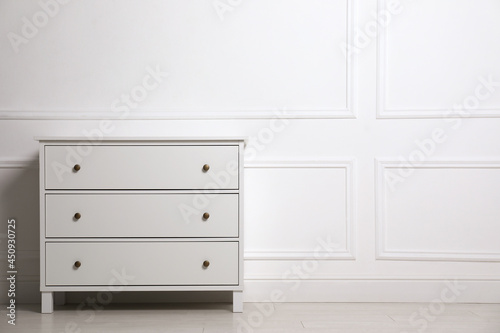 Fototapeta premium Stylish chest of drawers near white wall indoors, space for text