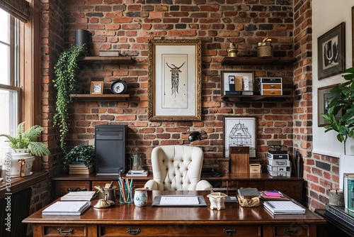 © Michael, Fototapeta premium Stylish Classic Office Design Featuring Cozy Brick Walls and Tidy Desk Essentials