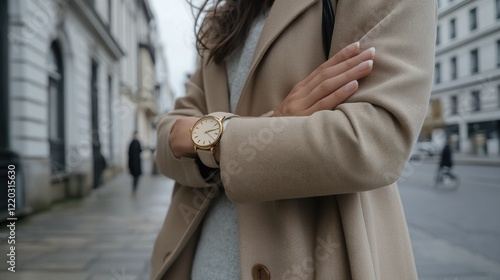 © Nuttaya Nampai, Fototapeta premium Stylish close-up of a golden hand watch on a woman's wrist, paired with chic street-style accessories in an urban European setting.