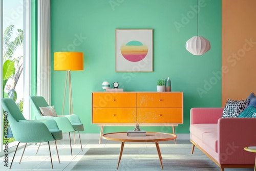 Obraz premium Stylish commode with an eye-catching lamp enhances the cheerful decor.
