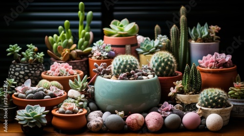 Fototapeta premium Stylish composition of home garden interior filled with beautiful plants, cacti, and succulents