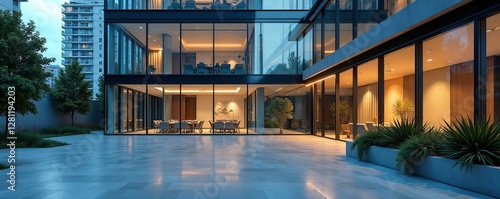 Obraz premium Stylish corporate office with modern glass facade and nested design elements,...