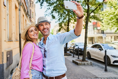 Naklejka premium Stylish couple takes selfie on city street