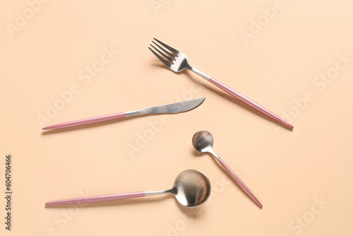 Fototapeta premium Stylish cutlery on beige background