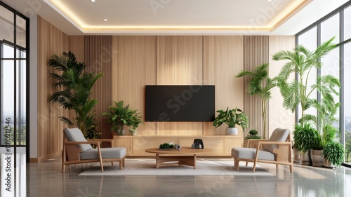 © Thi, Fototapeta premium Stylish 3D rendering of a contemporary living room featuring a sleek TV setup and modern decor elements.