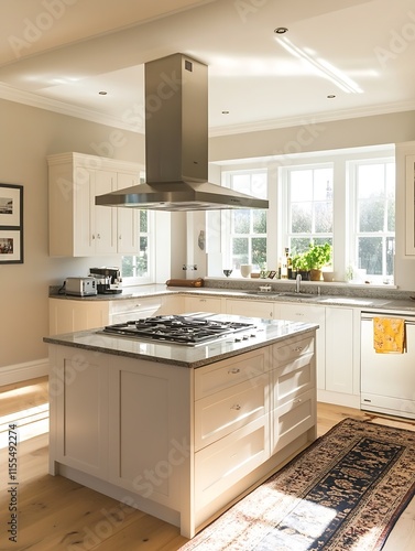 © Generative AI, Fototapeta premium Stylish Family Kitchen with Island and Abundant Natural Light : Generative AI