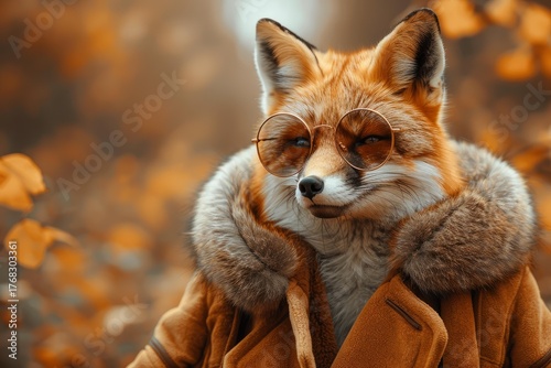 Obraz premium Stylish fox with round glasses and a warm coat posing in a beautiful autumn...
