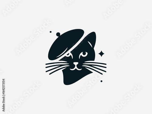 © Ani, Obraz premium Stylish French beret wearing cat vector logo illustration with elegant artistic flair
