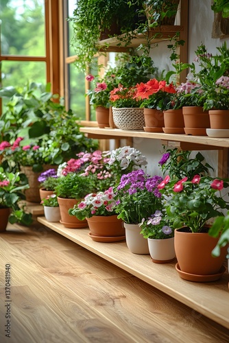 © Chanawat, Naklejka premium Stylish garden design with cute potted plants. Forest in the bedroom. Empty wall space above for text. Fresh, stylish, and natural feel. Ideal as a background for messages or home decor ads.