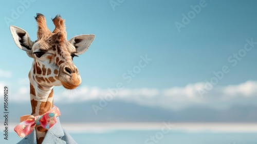 © cloud7days, Obraz premium Stylish giraffe in tailored suit gazing at reflection in lake.