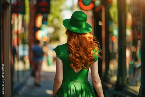 © KOSHKAROV SERGEI, Obraz premium Stylish girl in a green dress and matching hat walking down the street