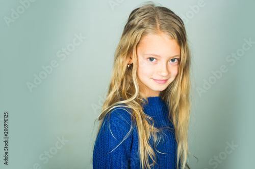 Fototapeta premium Stylish girl with pretty face on grey background. Beauty, kid fashion and...