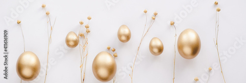 © Bugaev, Obraz premium Stylish golden eggs easter concept. Easter gold eggs with golden dried flax linum bunch white background. Flat lay trendy easter. Happy easter card. Copy space for text